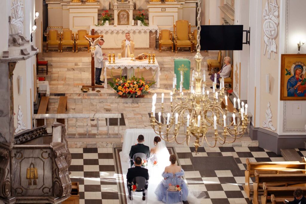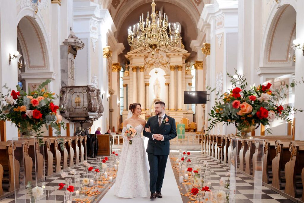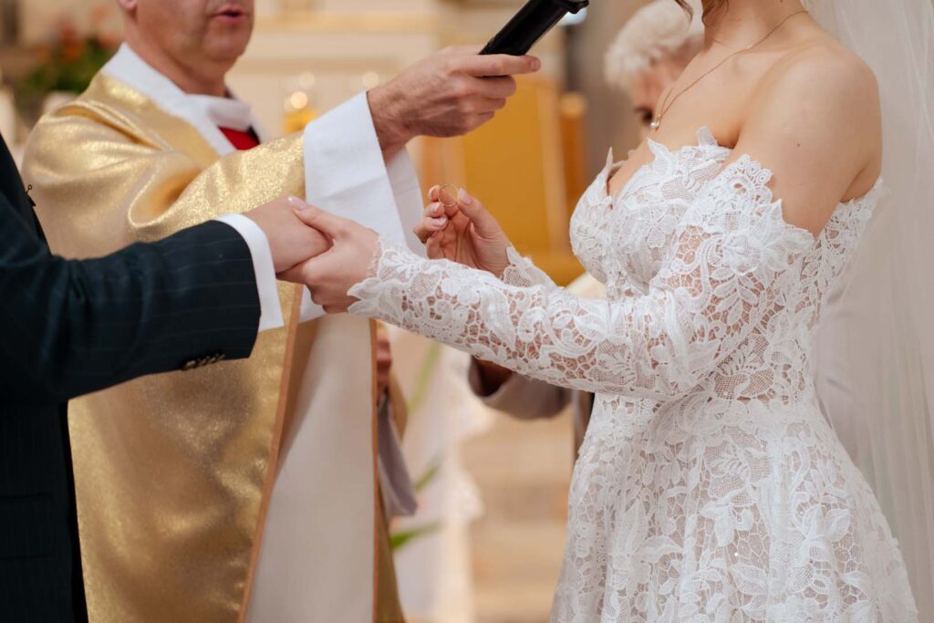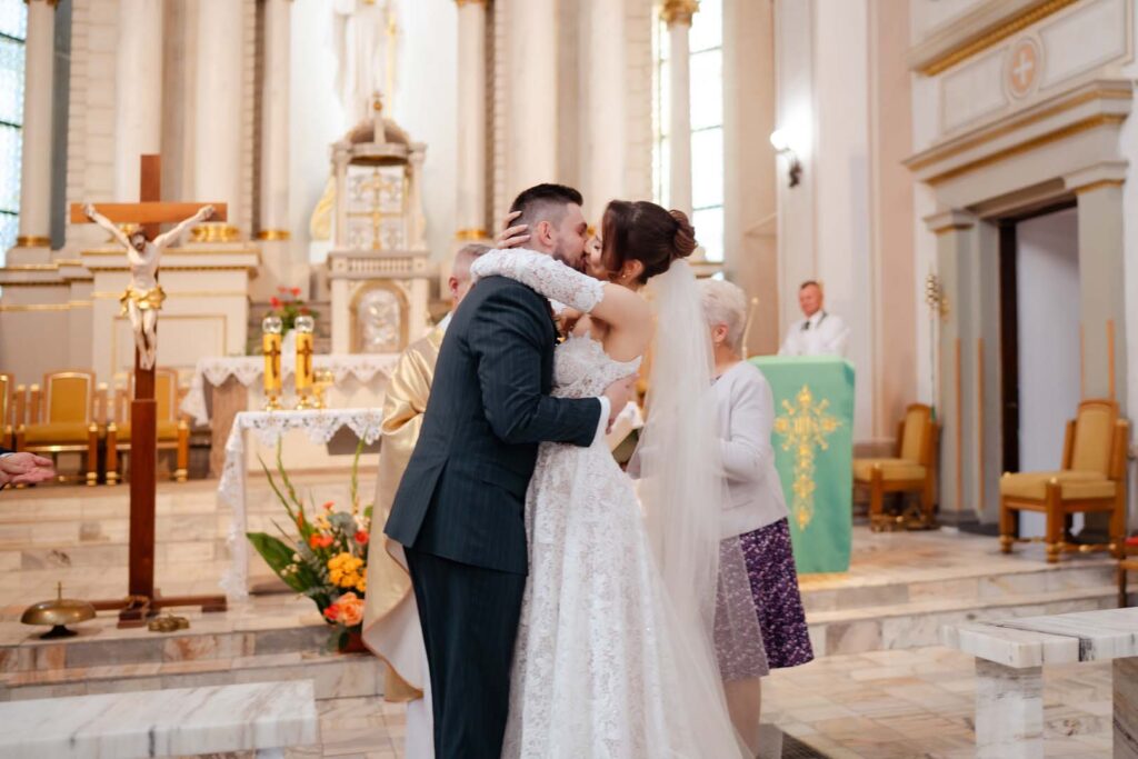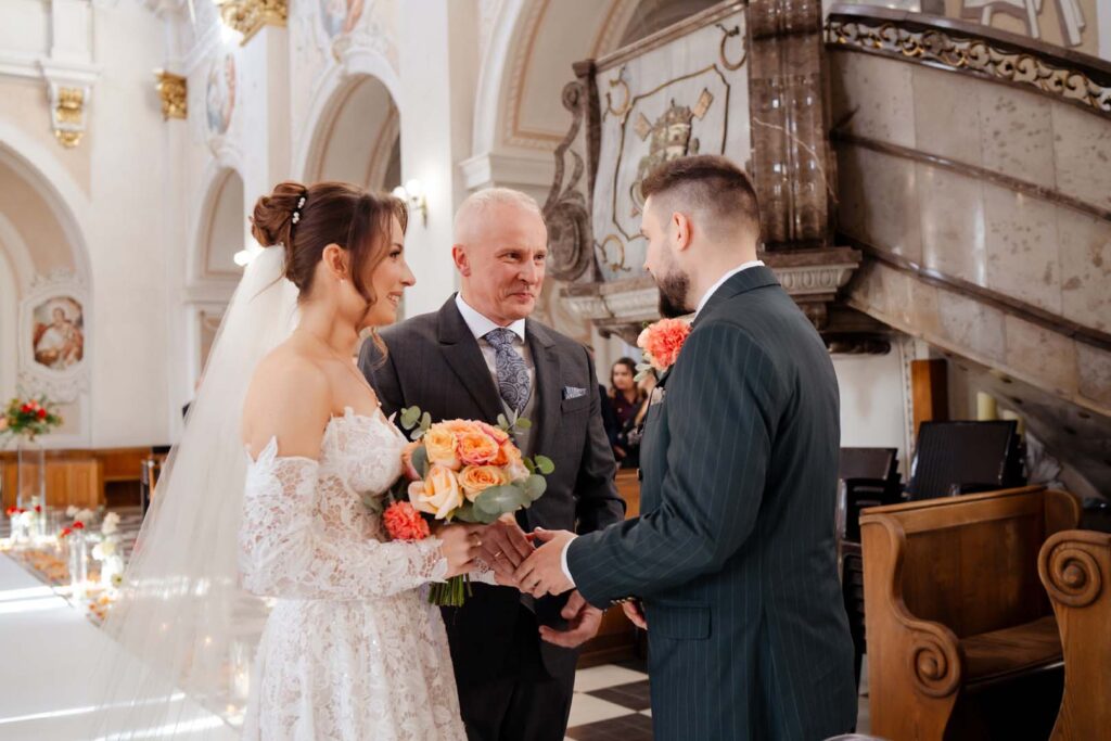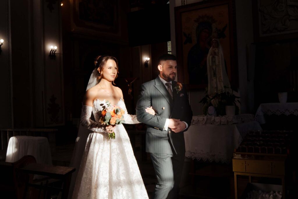 Uroczystość ślubna w kościele miała bardzo podniosły charakter. Szczególnie poruszający był moment, gdy tata prowadził swoją córkę przez nawę, by oddać ją w ręce ukochanego 🙂 . Emocje udzieliły się wszystkim obecnym – to były chwile pełne miłości i symboliki.