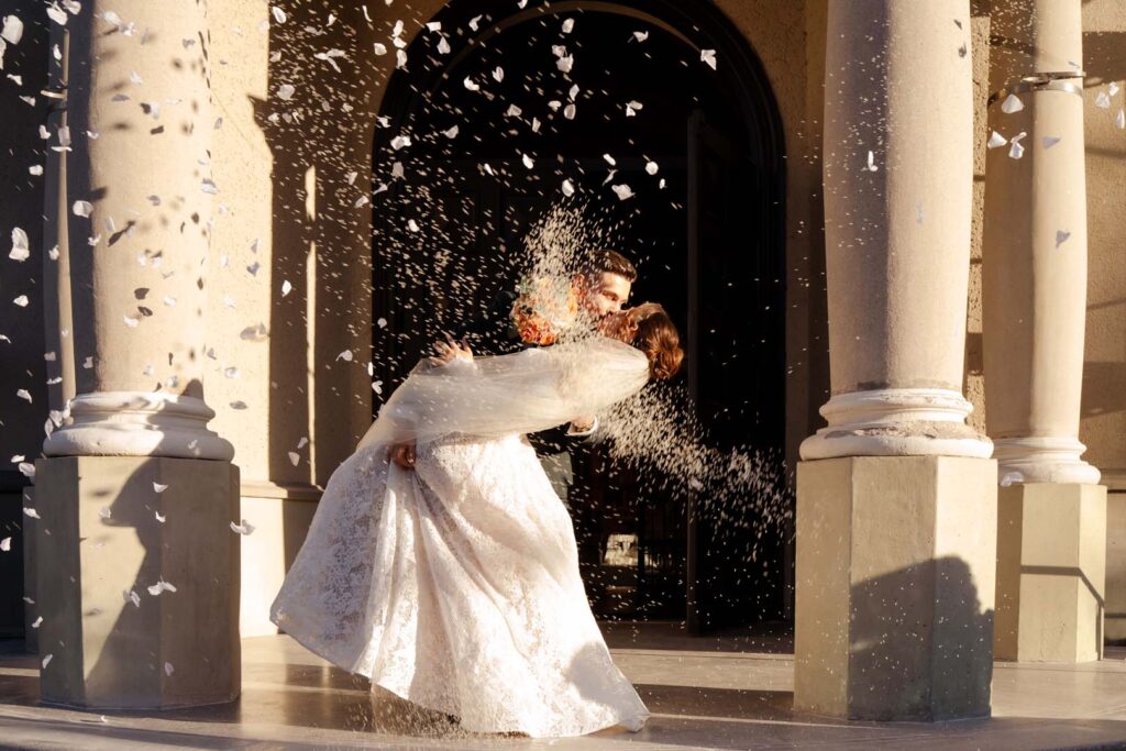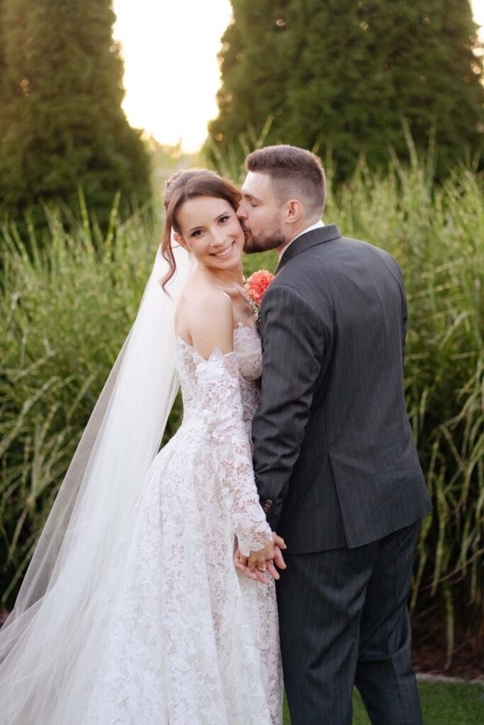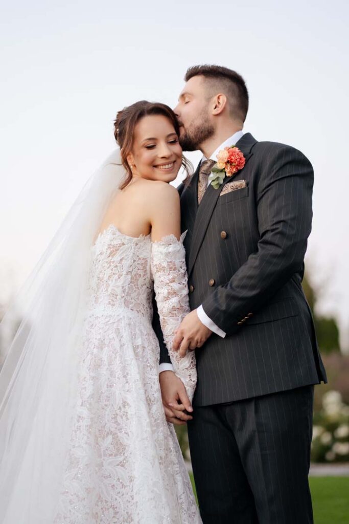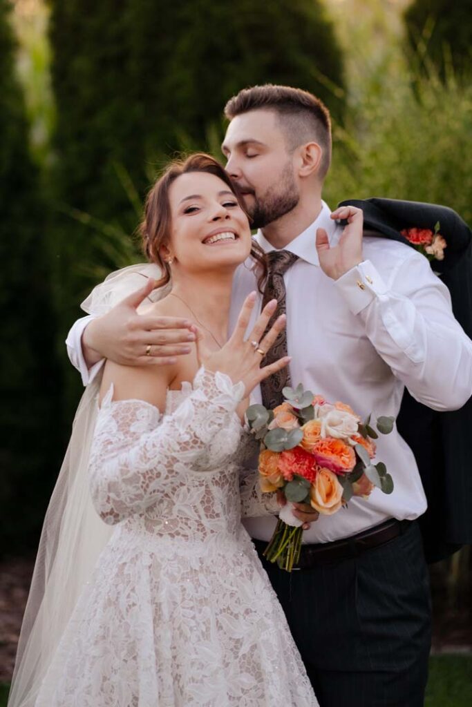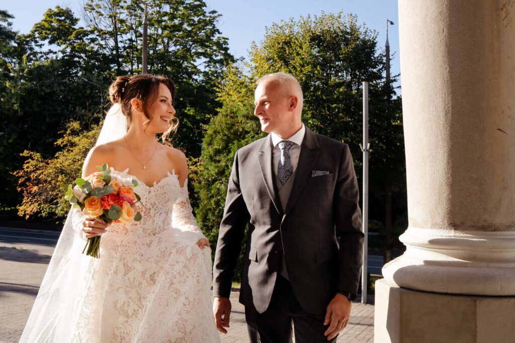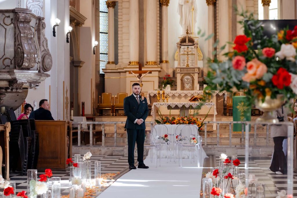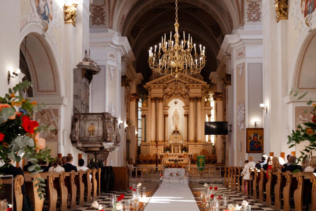 Uroczystość ślubna w kościele miała bardzo podniosły charakter. Szczególnie poruszający był moment, gdy tata prowadził swoją córkę przez nawę, by oddać ją w ręce ukochanego 🙂 . Emocje udzieliły się wszystkim obecnym – to były chwile pełne miłości i symboliki.