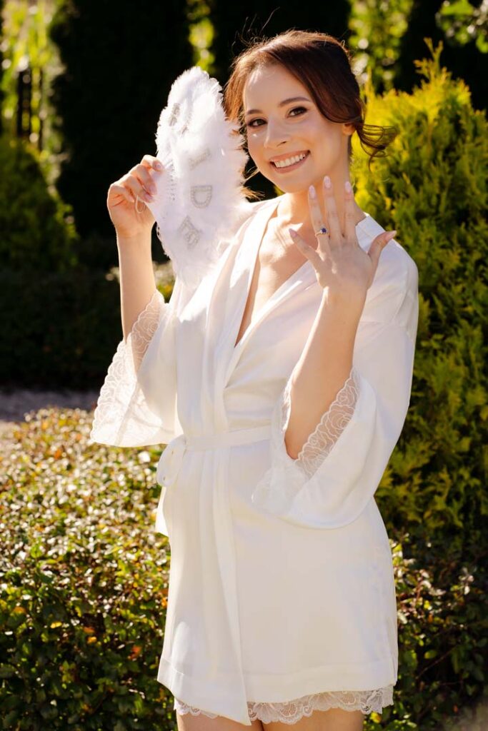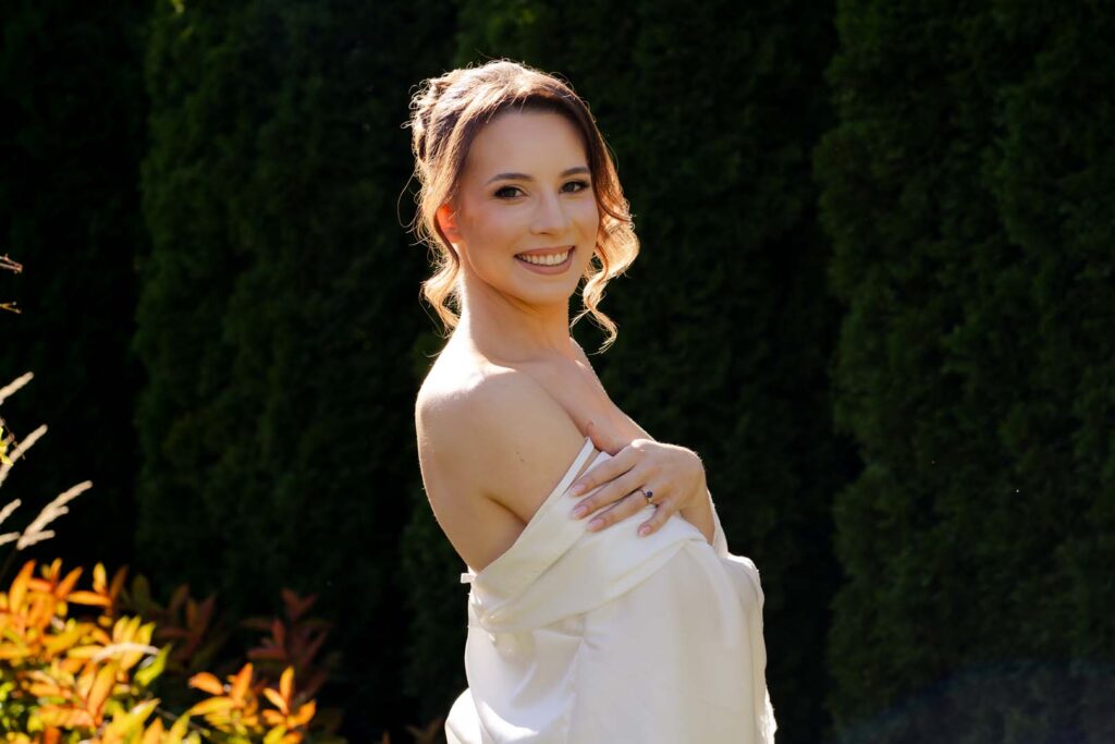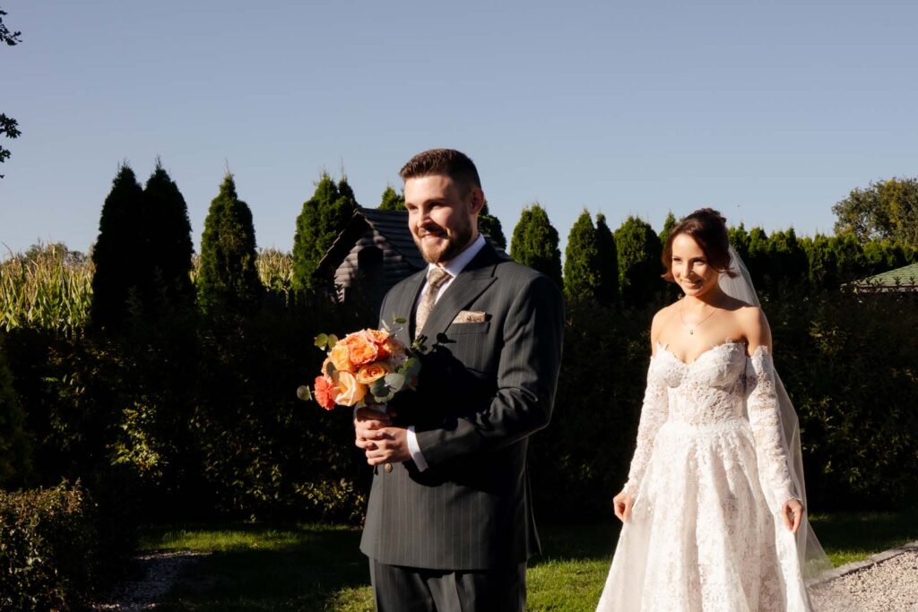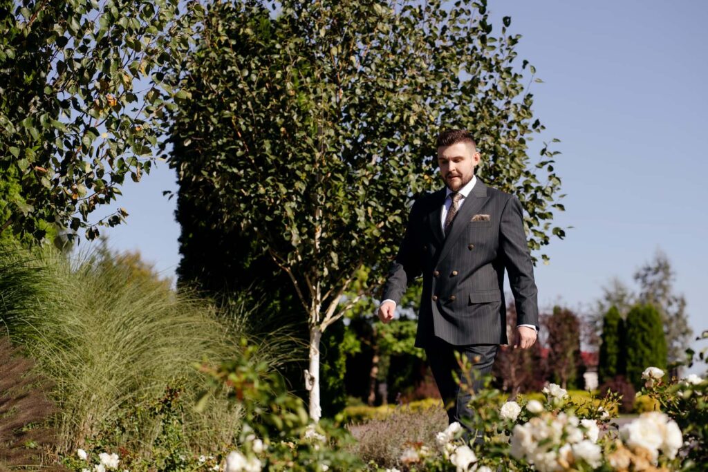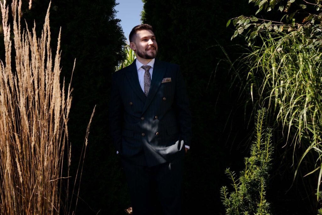 Przygotowania rozpoczęliśmy od portretów Pani Młodej. Dominika, ubrana w delikatny szlafrok, w towarzystwie druhny, pozowała w ogrodzie, gdzie panowała swobodna i radosna atmosfera. Naturalne światło, zieleń i uśmiechy sprawiły, że zdjęcia były pełne lekkości i kobiecej energii. Chwilę później przyszła pora na portrety Pana Młodego – również w ogrodzie, gdzie Piotr z dumą i spokojem oczekiwał dalszych wydarzeń.