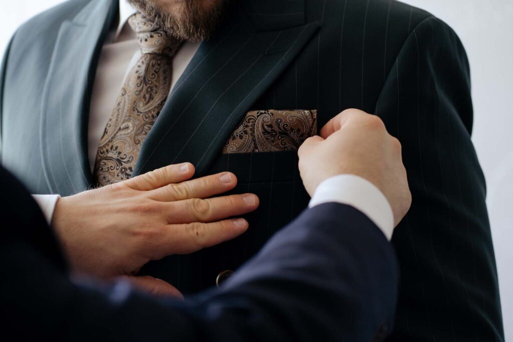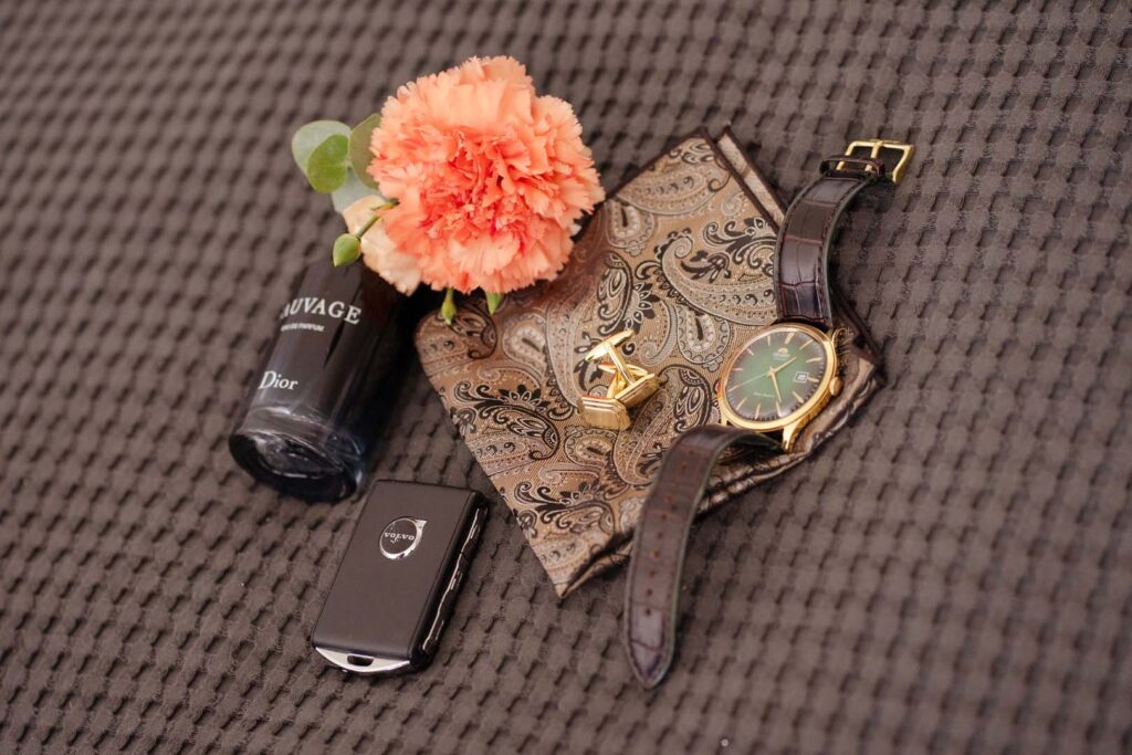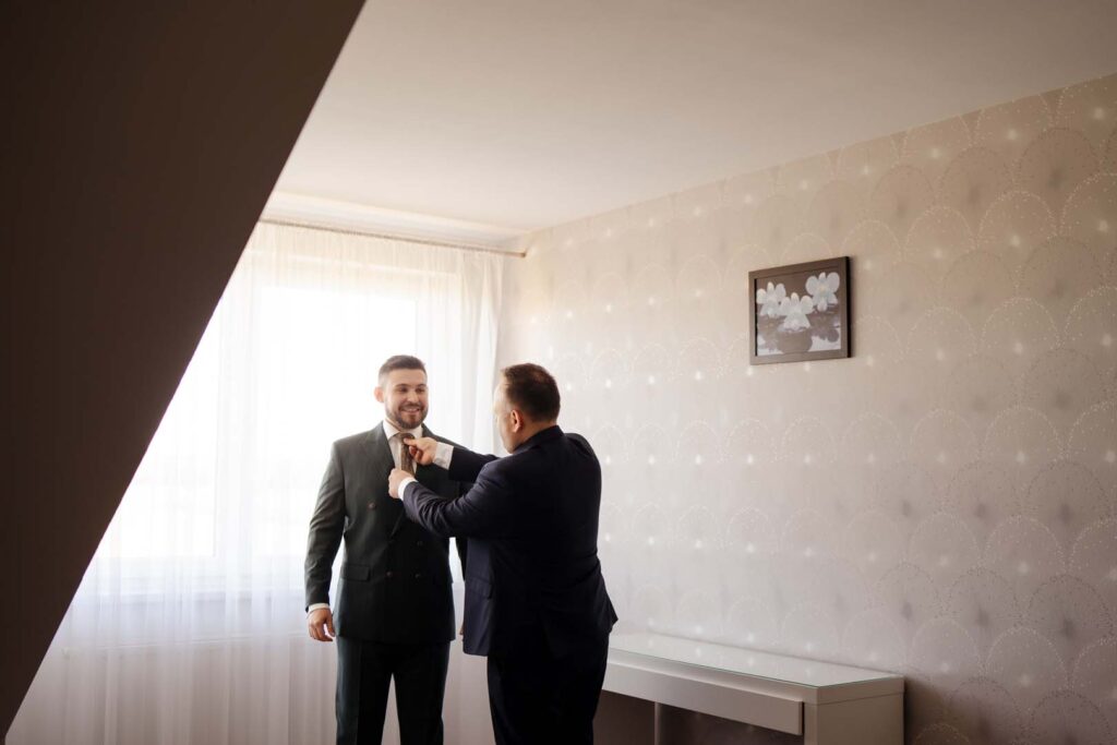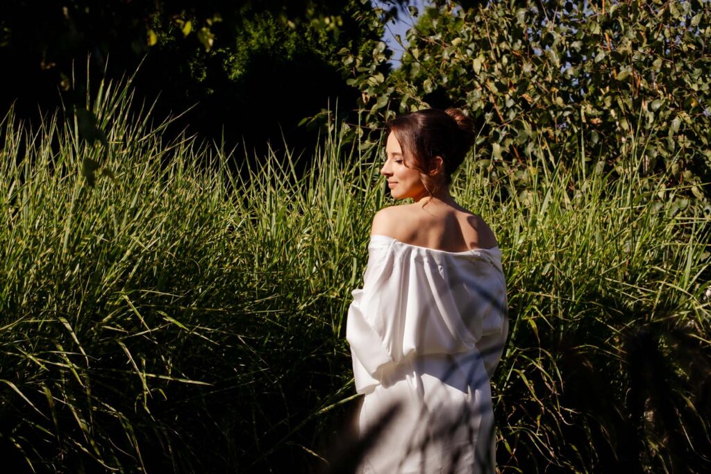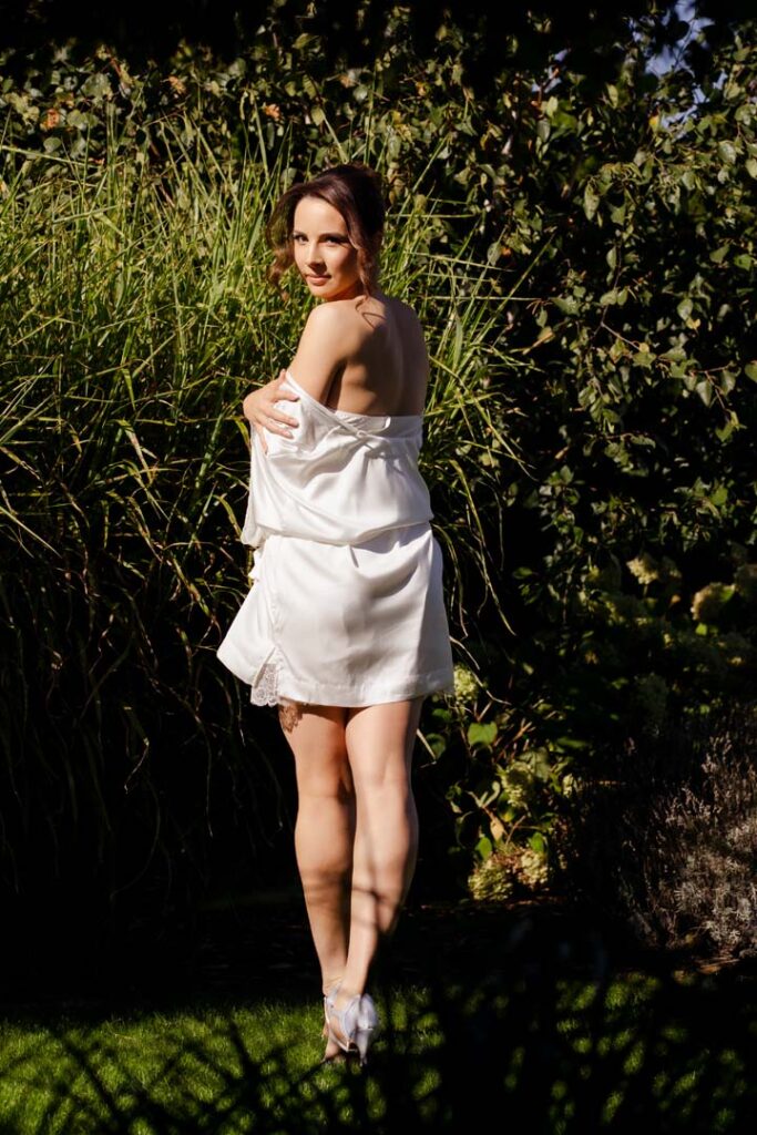 Przygotowania rozpoczęliśmy od portretów Pani Młodej. Dominika, ubrana w delikatny szlafrok, w towarzystwie druhny, pozowała w ogrodzie, gdzie panowała swobodna i radosna atmosfera. Naturalne światło, zieleń i uśmiechy sprawiły, że zdjęcia były pełne lekkości i kobiecej energii. Chwilę później przyszła pora na portrety Pana Młodego – również w ogrodzie, gdzie Piotr z dumą i spokojem oczekiwał dalszych wydarzeń.