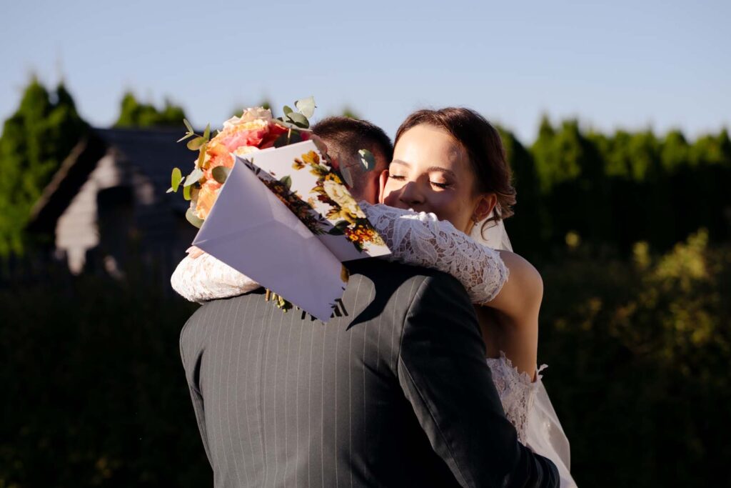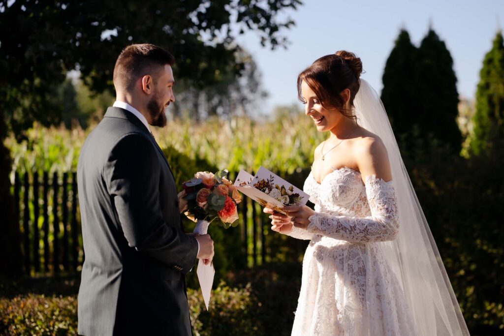 Narzeczeni zaplanowali wyjątkowy first look – moment pełen intymności i szczerych emocji. Zaraz po nim, z dala od gości, złożyli sobie własną, osobistą przysięgę ❤️📜. To była niezwykle wzruszająca chwila, której towarzyszyły łzy, przytulaski i prawdziwe poruszenie.