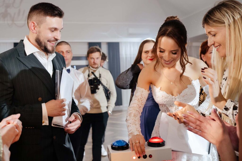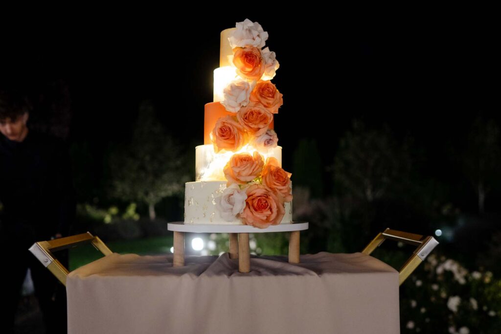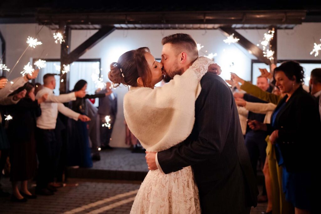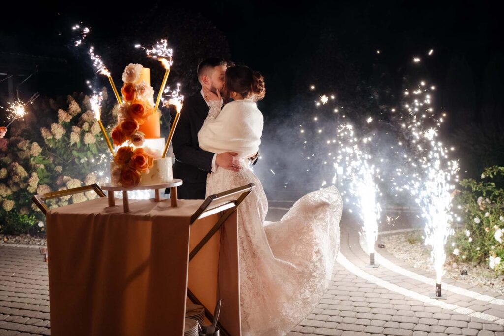 Ogromną atrakcją był pięknie zdobiony tort weselny 🎂, który zachwycił nie tylko smakiem, ale i wyglądem. Wieczór zwieńczyły zdjęcia z zimnymi ogniami, tworząc bajkową atmosferę i niezapomniane kadry.