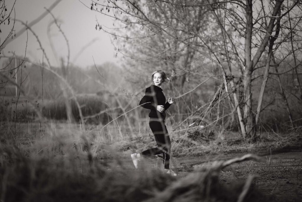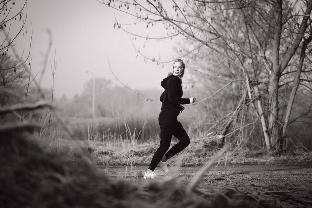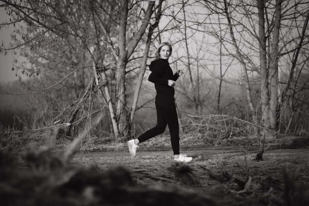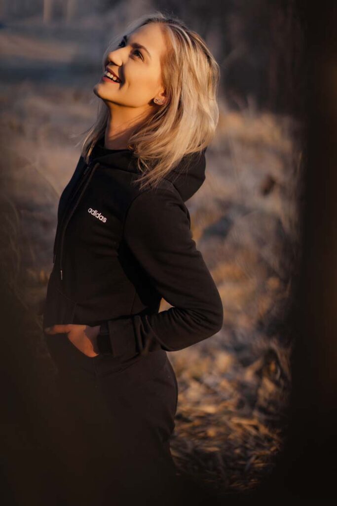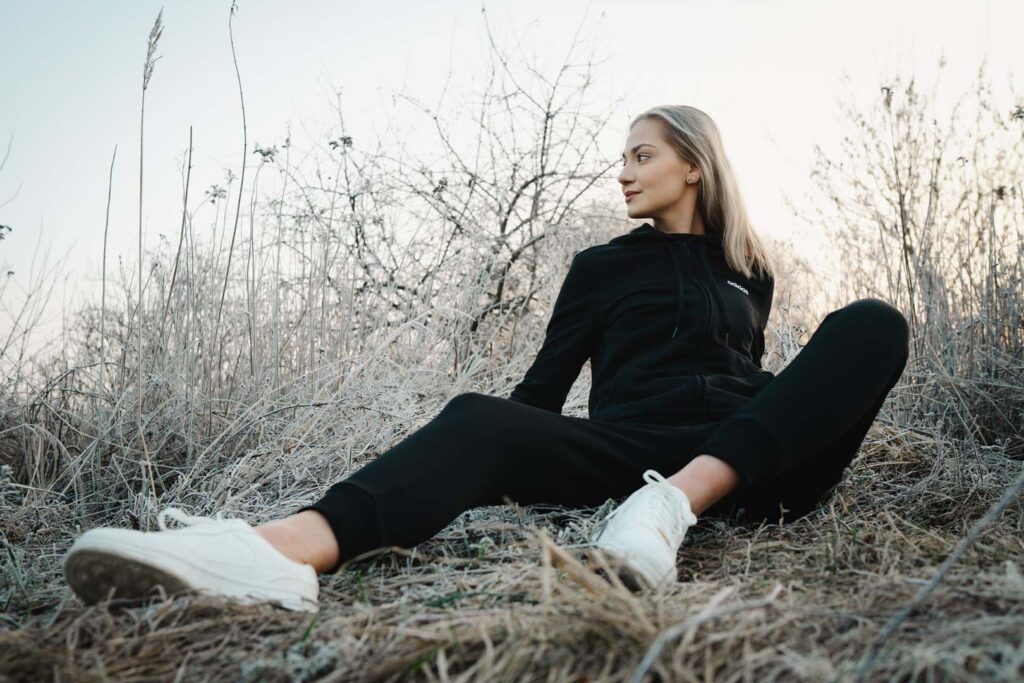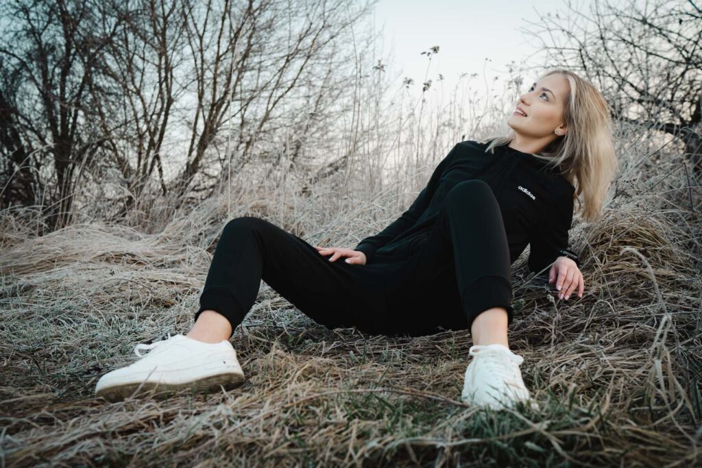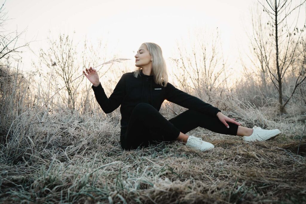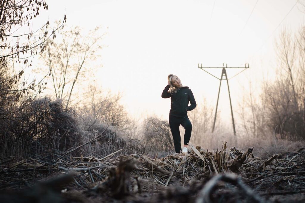 Sesja kobieca o wschodzie słońca ma w sobie coś niezwykłego. Na trawie błyszczał szron, który dodał zdjęciom wyjątkowego uroku i lekko bajkowego klimatu. Cały plan zdjęciowy przybrał formę treningu biegowego. Weronika wybrała dres 👟🧥, idealnie wpisujący się w naturalny, sportowy charakter sesji.